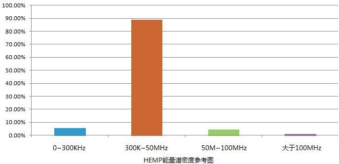 HEMP在地表附近傳播時(shí),大致為一個(gè)平面波。時(shí)域波形為一個(gè)雙指數(shù)波形,它的數(shù)學(xué)表達(dá)式為一個(gè)基于常數(shù)e的指數(shù)函數(shù)。根據(jù)行業(yè)的工程數(shù)據(jù),在目標(biāo)區(qū)域的功率頻譜分布大致如下圖所示 。